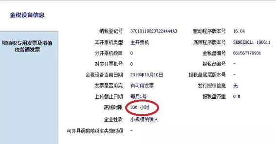 1、重新登录后开票软件后,你可以点击报税处理-状态查询-金税设备信息中核对你的离线时间是否为336小时,如下图所示: