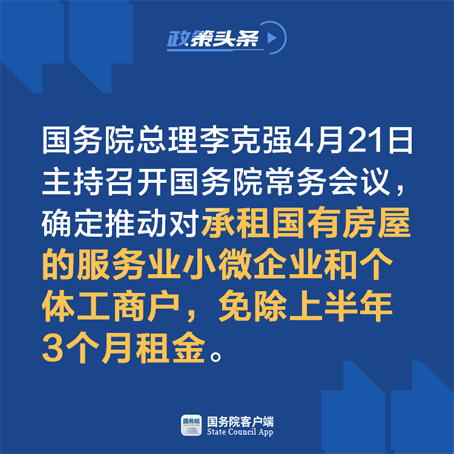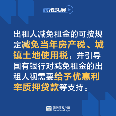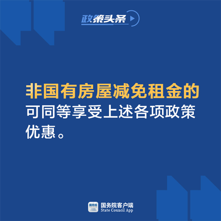 为减轻小微企业和个体工商户房租负担,昨天召开的国务院常务会议确定,推动对承租国有房屋的服务业小微企业和个体工商户,免除上半年3个月租金。国有企业尤其是央企和高校、研究院所等企事业单位要带头。出租人减免租金的可按规定减免当年房产税、城镇土地使用税,并引导国有银行对减免租金的出租人视需要给予优惠利率质押贷款等支持。非国有房屋减免租金的可同等享受上述各项政策优惠。