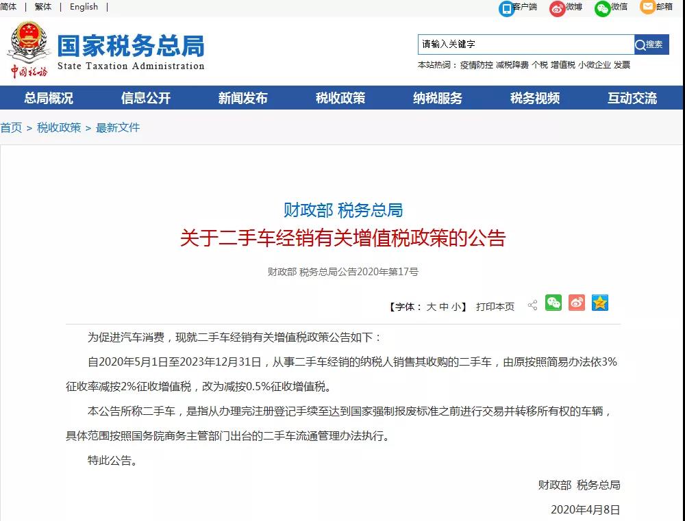 9.《财政部税务总局关于二手车经销有关增值税政策的公告》(财政部税务总局公告2020年第17号)